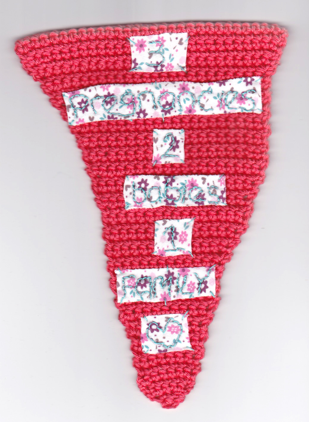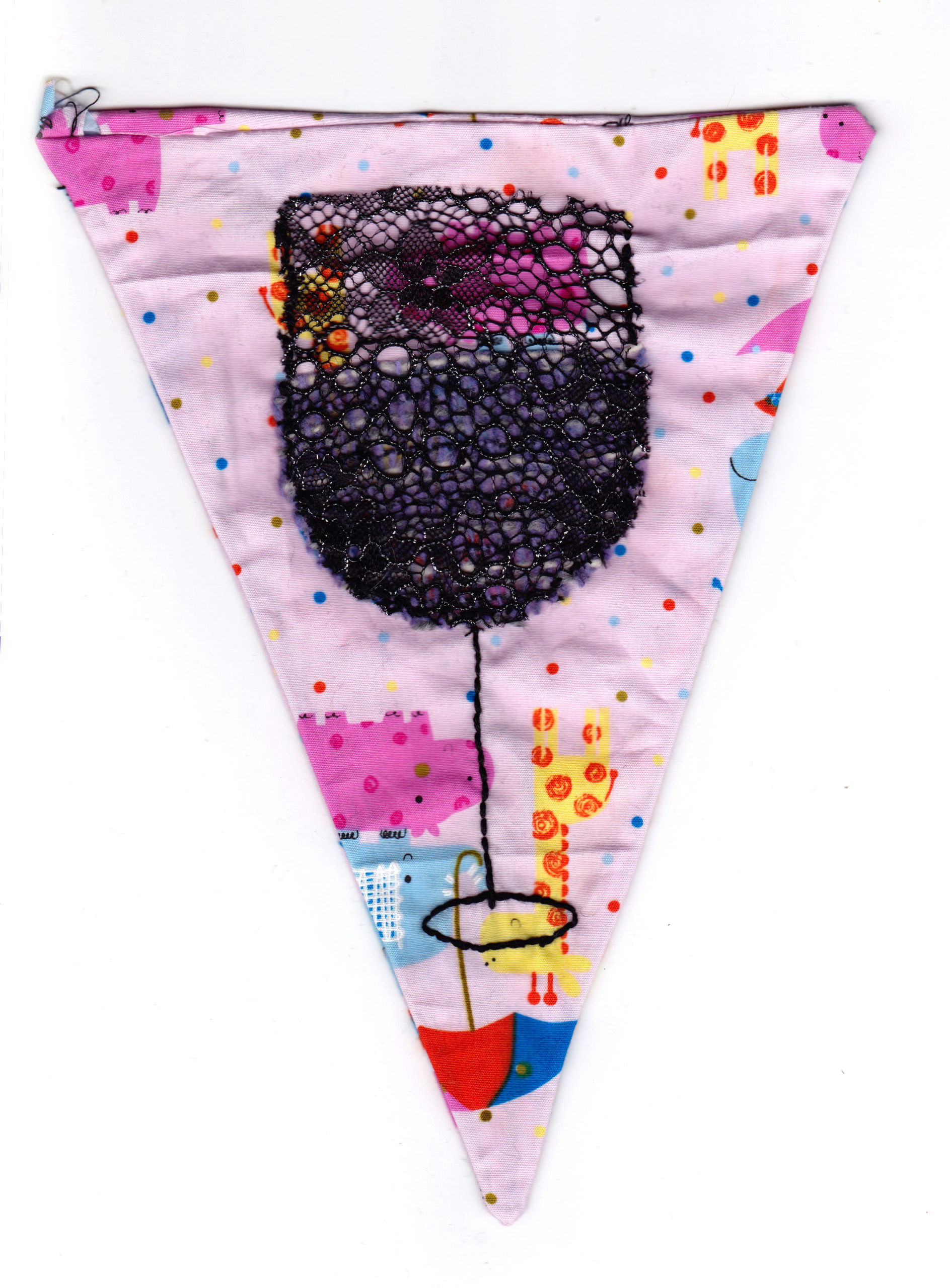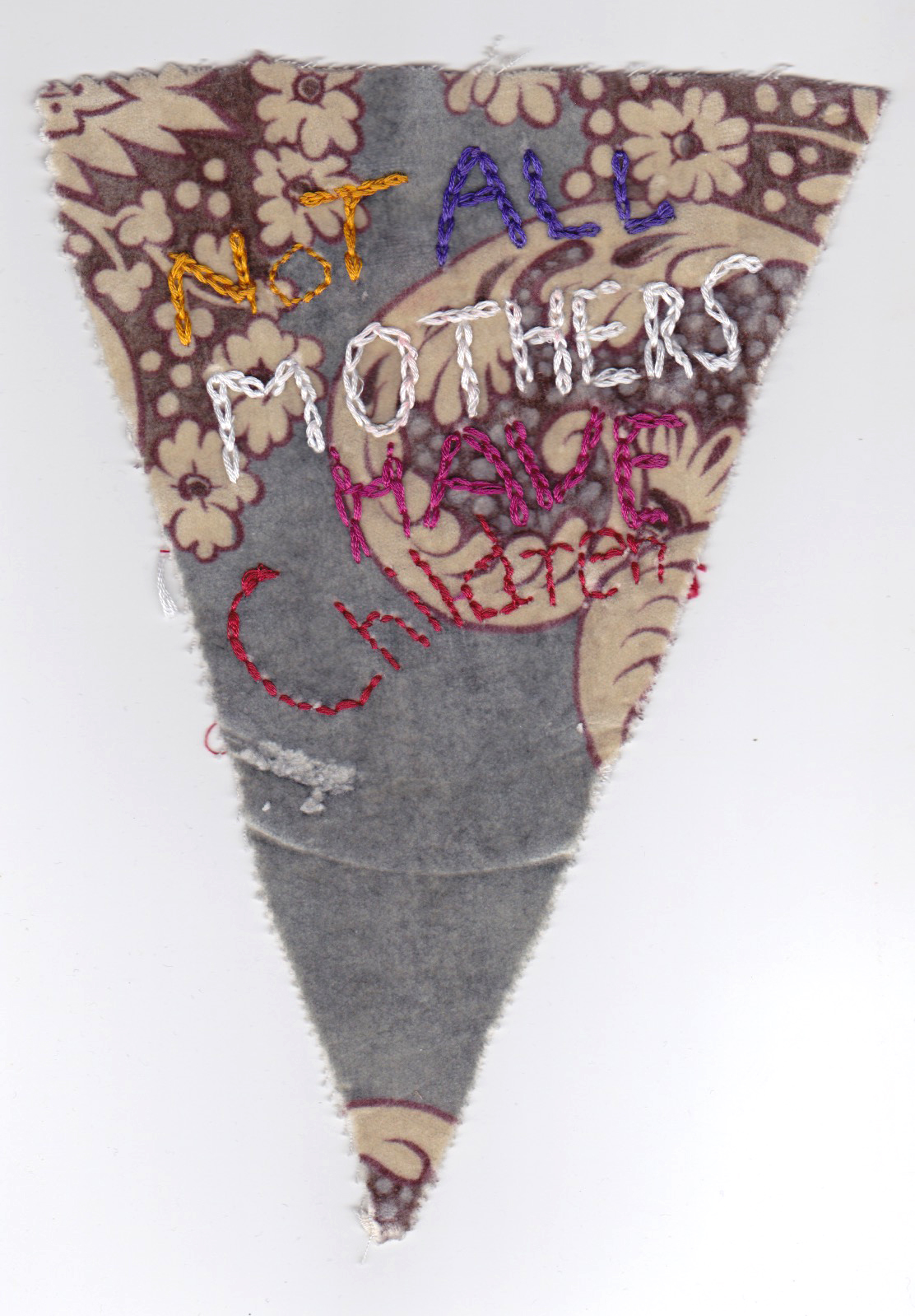 Bunting, that repeating triangle flag of cheeriness that decorates birthday parties and festivities, is now in the hands of feminist artists. Sarah Dixon, an artist based in Stroud, England, offers her Mother Bunting template for women to share their experiences of motherhood. Her original template, included here, opens up the boundaries of motherhood for everyone to tell “what is actually going on.” Maybe you screamed at your children this morning, or your body feels trashed. Maybe you lost your child, or are plagued by doubt, lack of sleep, or despair. There you are, at the party, smiling, and not saying any of this. Dixon champions women telling it like it is. These eight artists used her template in diverse, compelling ways. An embroidered fetus, lushly cushioned in colors and folds, centers in the home of the mother’s triangle. An exploration of the total explosion of absolute NOISE that happens with children surrounds the suggestion to “accept” these sounds. A beautiful vagina, hairy with black lace, spills out of the edges of society’s rigid bikini lines. Another bit of black lace with a knowing attitude styles a wine glass that overlays an innocent nursery print with giraffes and elephants. An anime-inspired family scene depicts a mother holding a steady space for two children, including crying baby and bottle, her firm determination mixed in with the authenticity of her smile. Another piece offers the stark reminder that “not all mothers have children.” Here at Mom Egg Review, we celebrate the varieties of motherhood, and we salute Sarah and her fellow artists. How would you style your triangle? –Ana Silva, Gallery Editor