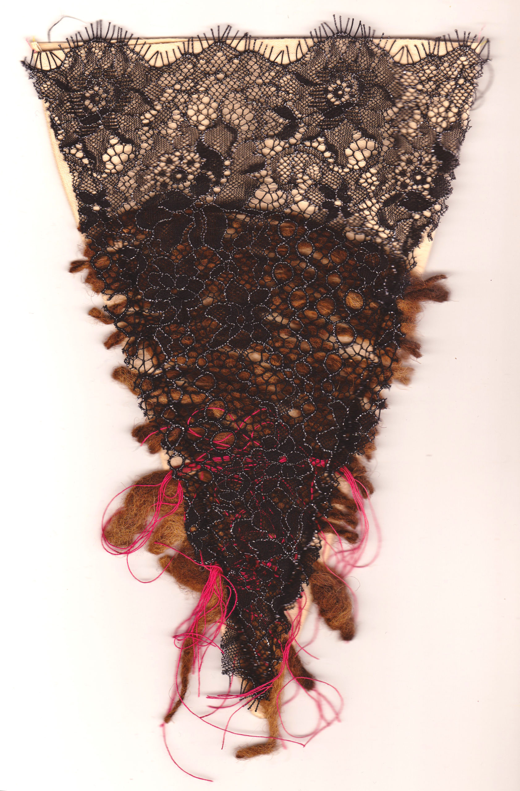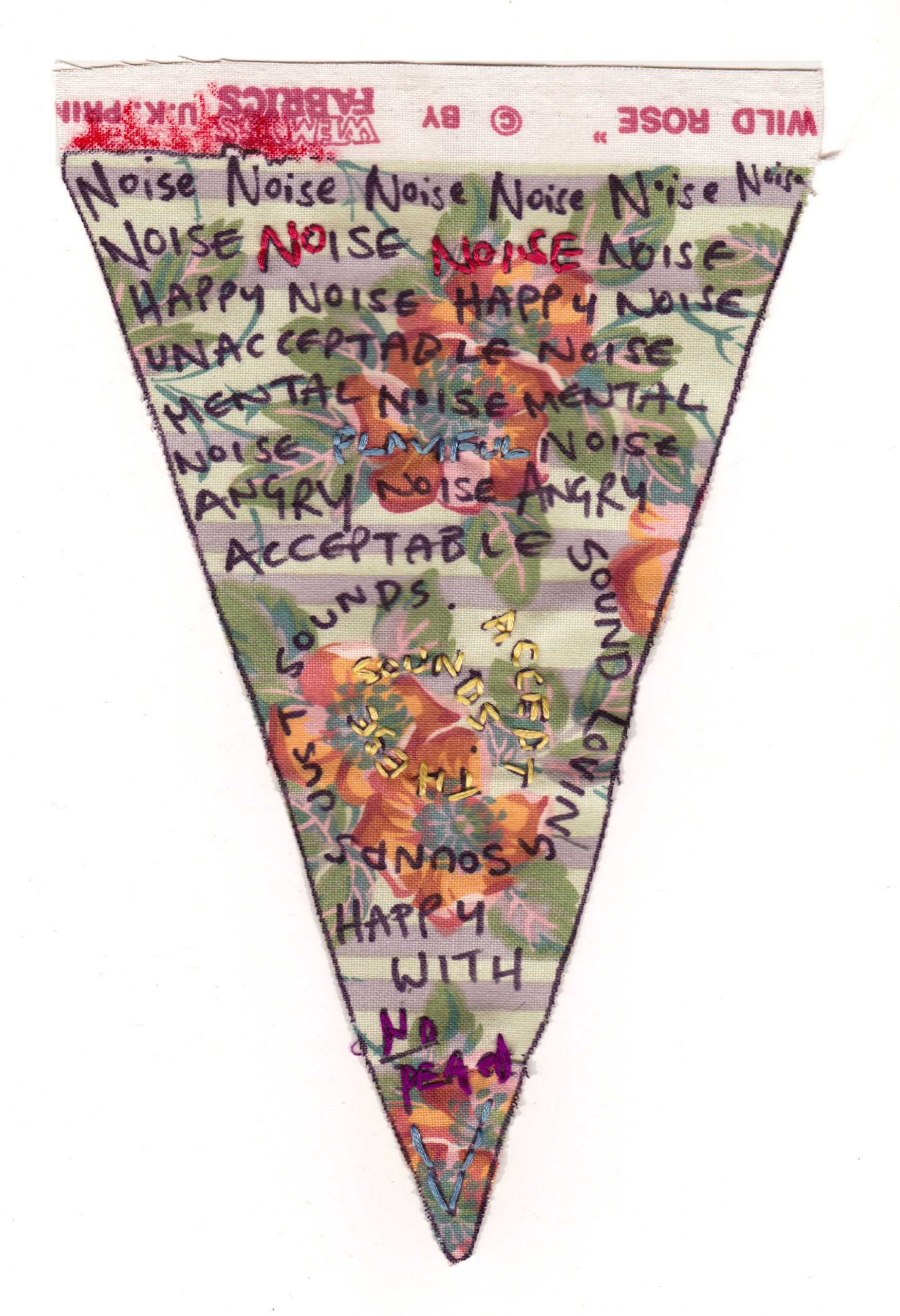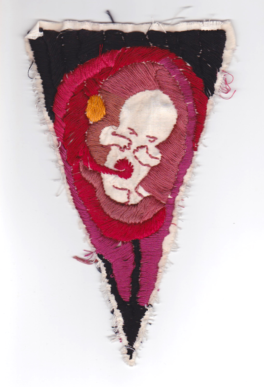 Bunting, that repeating triangle flag of cheeriness that decorates birthday parties and festivities, is now in the hands of feminist artists. Sarah Dixon, an artist based in Stroud, England, offers her Mother Bunting template for women to share their experiences of motherhood. Her original template, included here, opens up the boundaries of motherhood for everyone to tell “what is actually going on.” Maybe you screamed at your children this morning, or your body feels trashed. Maybe you lost your child, or are plagued by doubt, lack of sleep, or despair. There you are, at the party, smiling, and not saying any of this. Dixon champions women telling it like it is. These eight artists used her template in diverse, compelling ways. An embroidered fetus, lushly cushioned in colors and folds, centers in the home of the mother’s triangle. An exploration of the total explosion of absolute NOISE that happens with children surrounds the suggestion to “accept” these sounds. A beautiful vagina, hairy with black lace, spills out of the edges of society’s rigid bikini lines. Another bit of black lace with a knowing attitude styles a wine glass that overlays an innocent nursery print with giraffes and elephants. An anime-inspired family scene depicts a mother holding a steady space for two children, including crying baby and bottle, her firm determination mixed in with the authenticity of her smile. Another piece offers the stark reminder that “not all mothers have children.” Here at Mom Egg Review, we celebrate the varieties of motherhood, and we salute Sarah and her fellow artists. How would you style your triangle? –Ana Silva, Gallery Editor