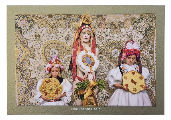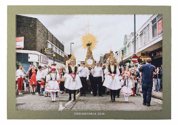 Dressed in traditional Czech outfits, ornate with sensuous red ribbons and elaborate baked accessories, two women lead a procession via Erdington’s High Street. Their white skirts are decorated with flowery patterns and bunched around their hips, emphasising the connection with nature and its fertility. The work subtly harks back to the history of Erdington, which remained a rural area until recent times. Accompanied by two young girls and followed by a simple wooden frame made of celestial crust (sugary pastries based on an old Czech recipe) topped by a small figurine of Virgin Mary and carried on men’s shoulders, the procession was joined by a multinational crowd, old and young. All precincts vanished for the duration of the performance and the lively chatting was underscored by accompanying cello music performed by Bela Emerson, resulting in a festive atmosphere that resonated within the surroundings.