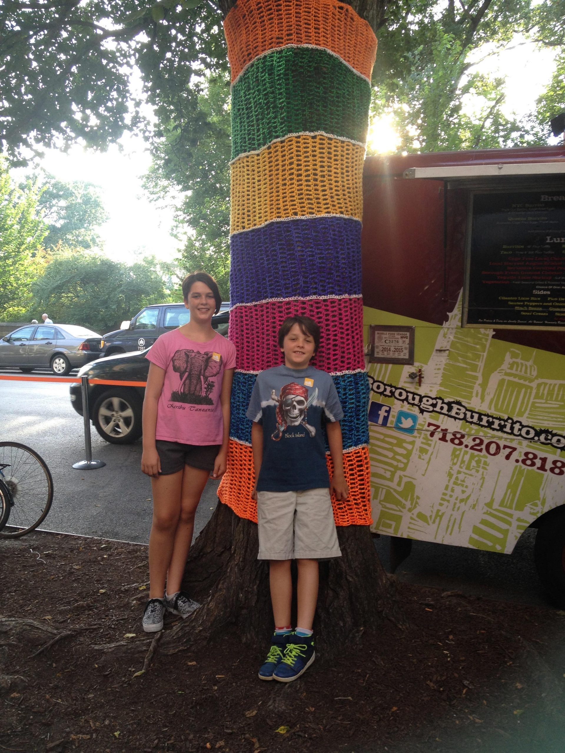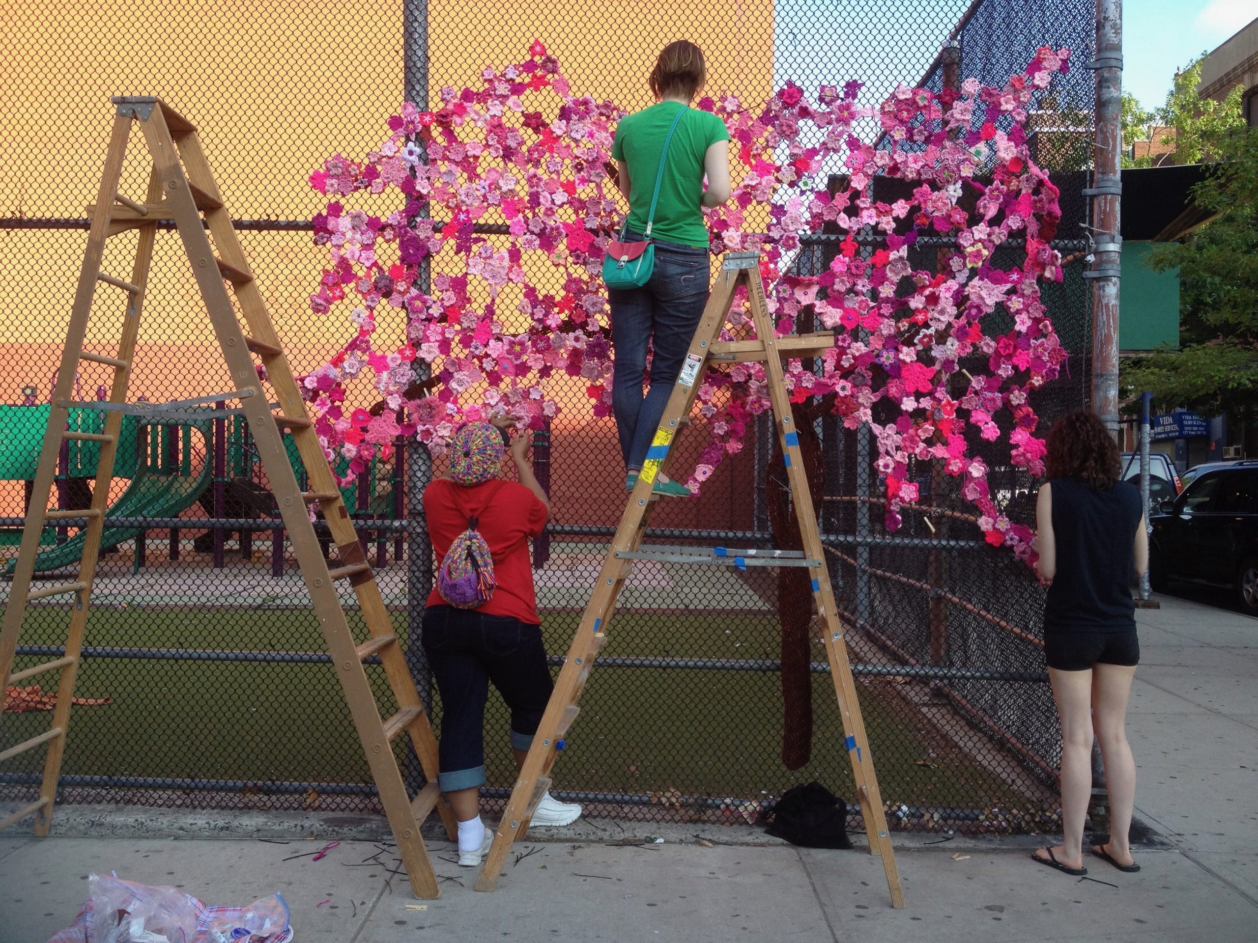 After five years of semi-secret random acts of beauty, Lawrence wants to “step out and be bold.” She wants to enrich her relationships with neighbors. Lawrence observes that in el Barrio, “people like to tell their stories through art, through music.” She says, “I don’t want only my art to do my engagement anymore;” and has begun teaching crochet in schools and local senior centers. She runs sessions at la Galeria del Barrio with a Creative Engagement grant from Lower Manhattan Cultural Council which will result in a huge community-made mural on 121st and Park Avenue in July. Fueled by her Christian faith, Lawrence wants to “to use what I do to love my neighbors more.” She knows from experience that the deeper relationships she seeks will happen more organically in the slowed-down space where she teaches the interlocking loopings of crochet alongside grandmothers, mothers, and their children.