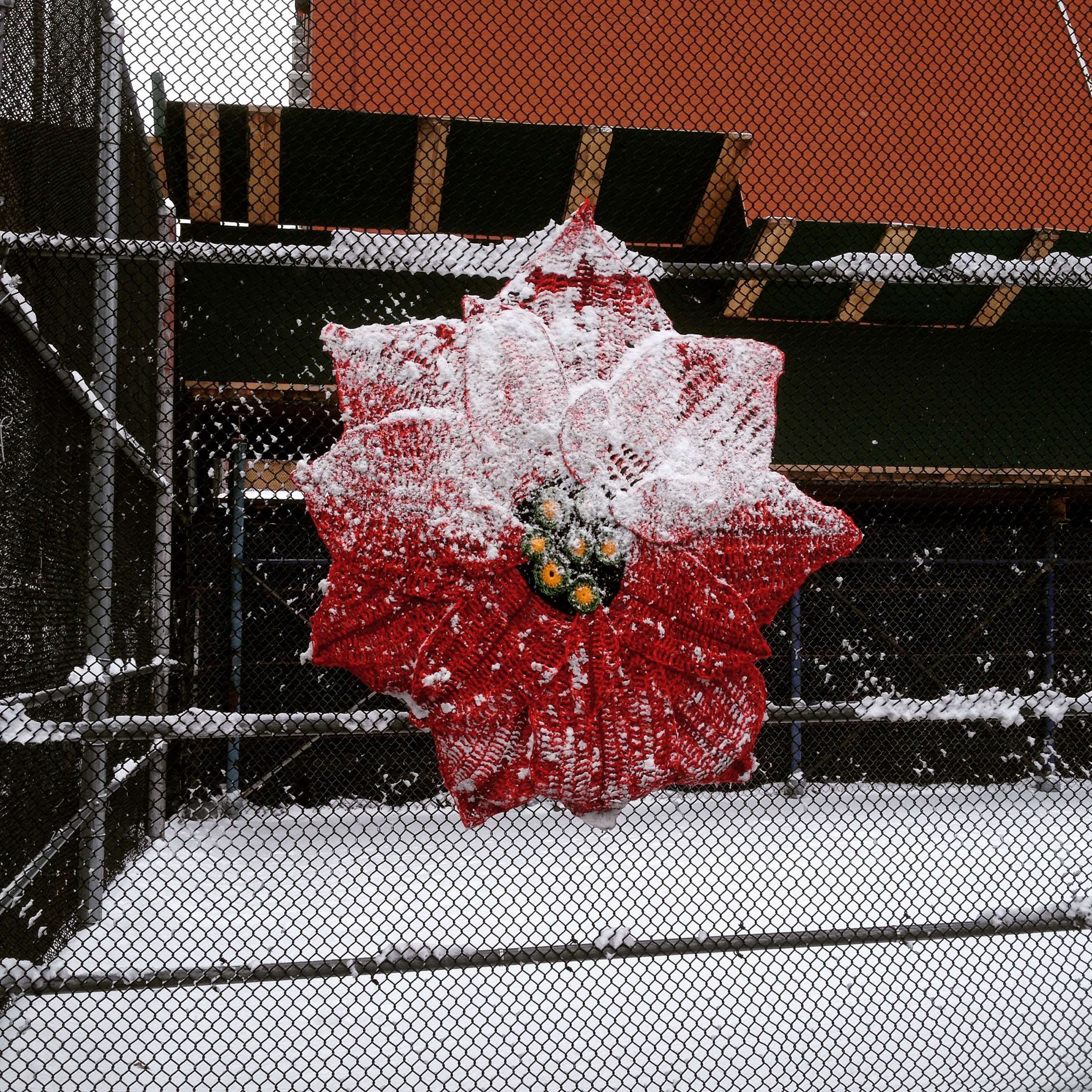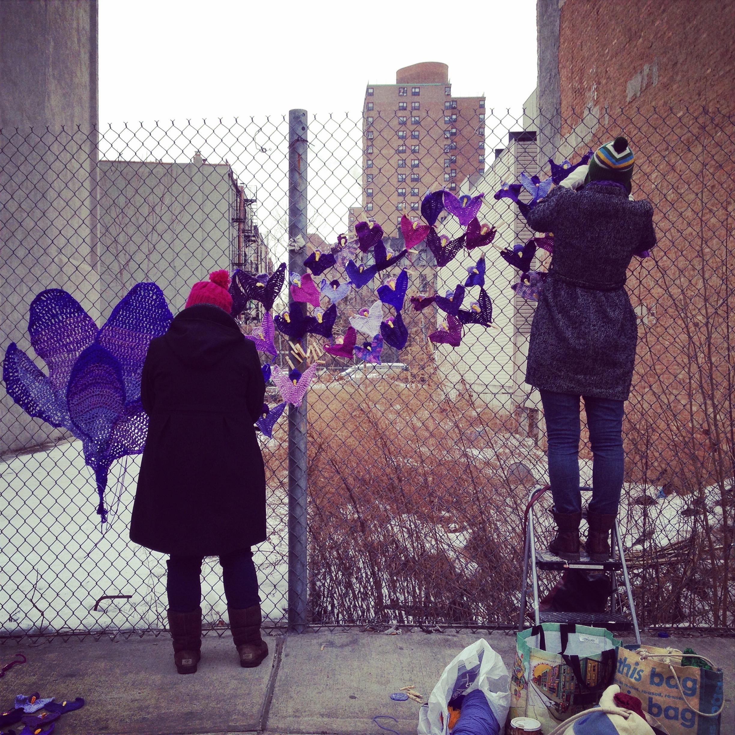 Several cross-referenced google searches later, I messaged her, thanking her for her fierce and comforting work. Soon after, she invited us to join neighbors to lift up a peace sign, made of tiny crocheted flowers, onto a fence at Lexington and 104th, the night before the dreaded inauguration. This late-night yarn bombing in the cool, dark air was a blessed moment of peaceful resistance for all of us.