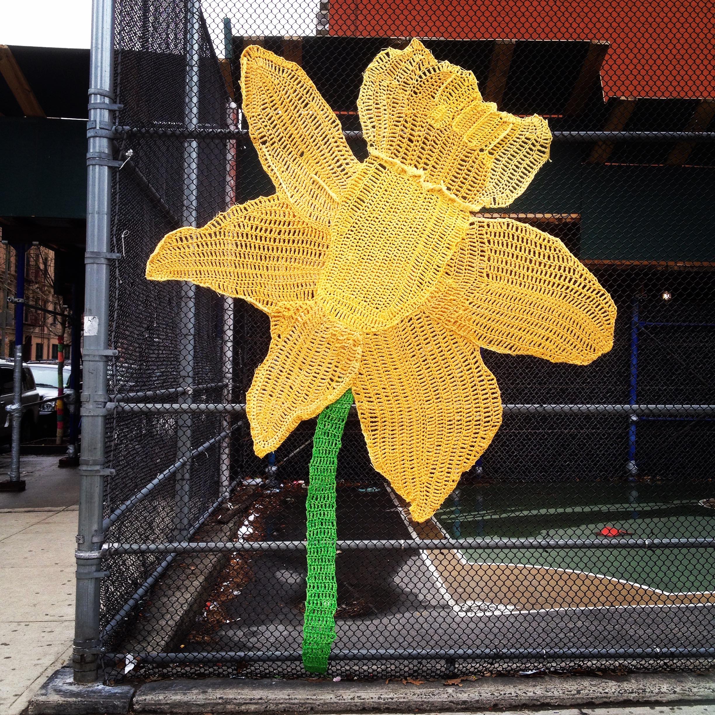 I admit I cyber-stalked Naomi Lawrence. Her flower creations started appearing around El Barrio, in NYC, about 2014, on metal fences; bright spots of improbably large flowers floating in front of abandoned lots. Blue iris, orange daylily, crocuses, cherry blossoms, daffodils, hibiscus, lotus, magnolia, and rose, thrilling in their audacity. My young daughters liked to point out the unexpected yarn art of their Spanish Harlem neighborhood to visiting playdates. City tree trunks, usually looking so sad in their untended pits, threatened by erosion, litter, and neglect, suddenly sported colorful stripes or patchwork, warmed and protected by this mysterious person’s art. Just after the election, I decided, “I really want to meet this woman.”