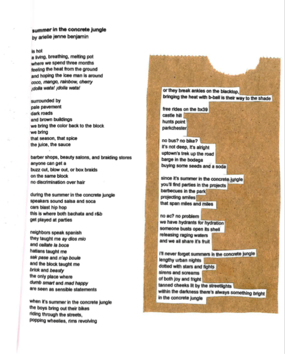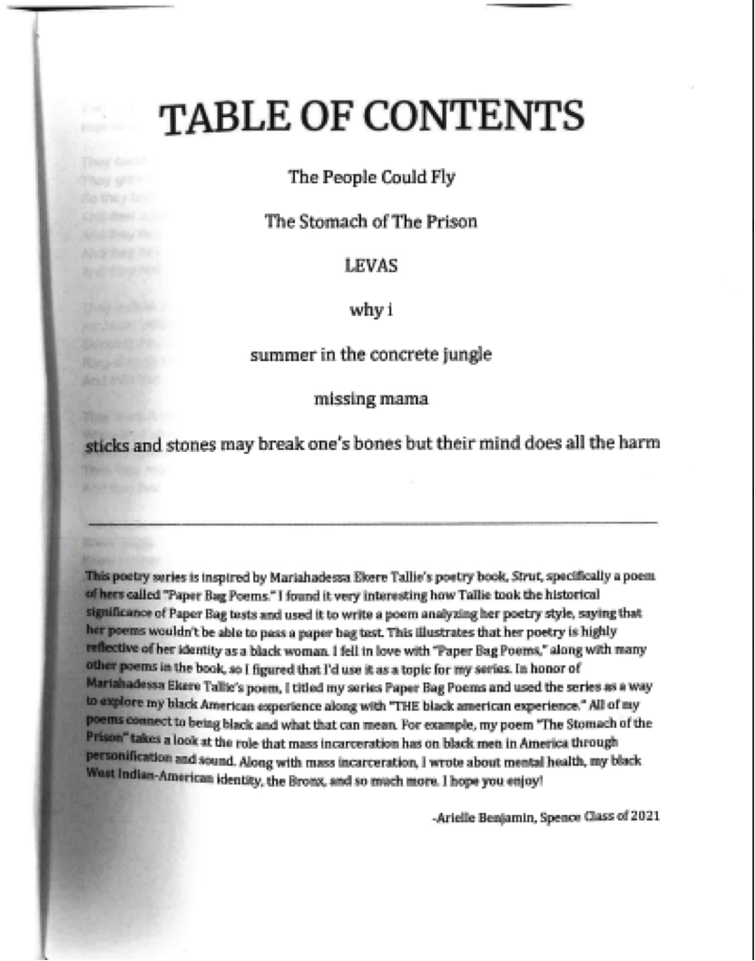This poetry series is inspired by Mariahadessa Ekere Tallie’s poetry book, Strut, specifically a poem of hers called “Paper Bag Poems.” I found it very interesting how Tallie took the historical significance of Paper Bag tests and used it to write a poem analyzing her poetry style, saying that her poems wouldn’t be able to pass a paper bag test. This illustrates that her poetry is highly reflective of her identity as a black woman. In honor of Mariahadessa Ekere Tallie’s poem, I titled my series Paper Bag Poems and used the series as a way to explore my black American experience along with “THE Black American experience.” All of my poems connect to being black and what that can mean. For example, my poem “The Stomach of the Prison” takes a look at the role that mass incarceration has on black men in America through personification and sound. Along with mass incarceration, I wrote about mental health, my black West Indian-American identity, the Bronx, and so much more.